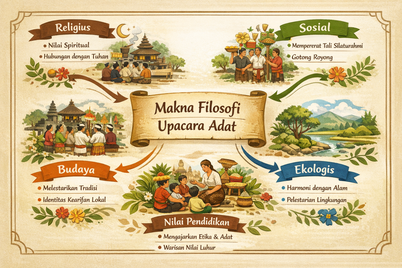 “Makna filosofi upacara adat yaiku isi nilai lan piwulang luhur sing kinandhut ing saben tata cara upacara adat. Makna iki nggambarake cara pandang lan kapercayan masyarakat tumrap hubungan manungsa karo Gusti, sesami, alam, lan budayane. Liwat upacara adat, masyarakat nyawijèkaké nilai spiritual, sosial, budaya, lan etika urip supaya tatanan urip tetep rukun, harmonis, lan lestari.”